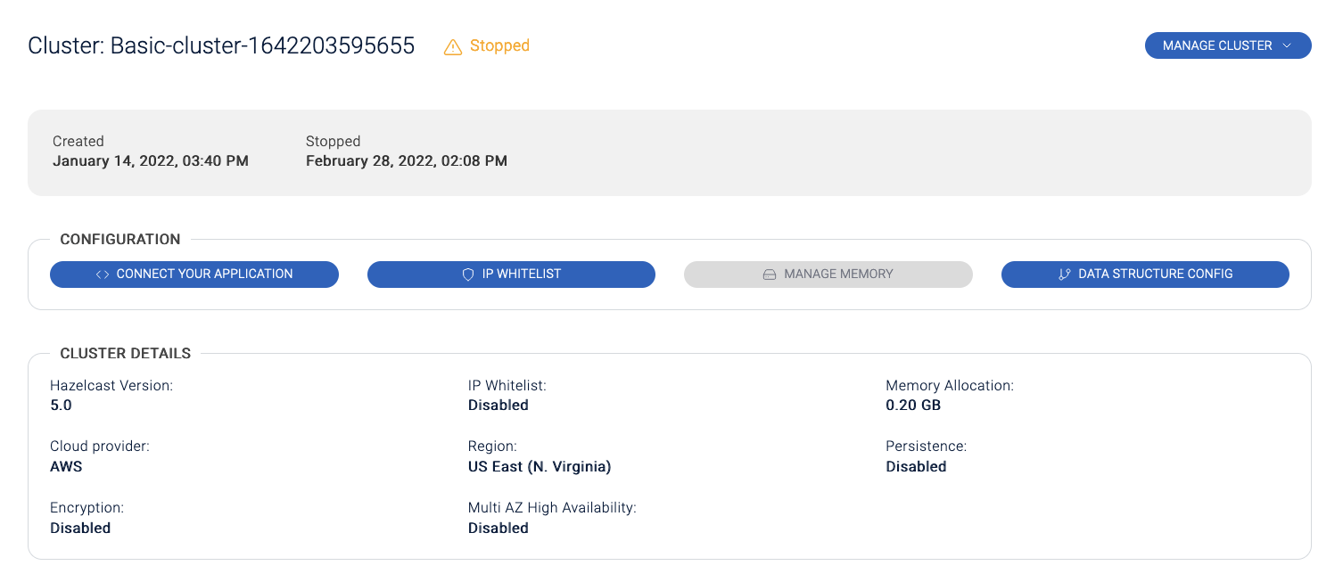 If your cluster is noted as “stopped”, click the “Manage Cluster” menu option and resume the cluster — this will take a few seconds to spin up. Once the cluster is running, we can write some CFML code that connects to Hazelcast from our web app.